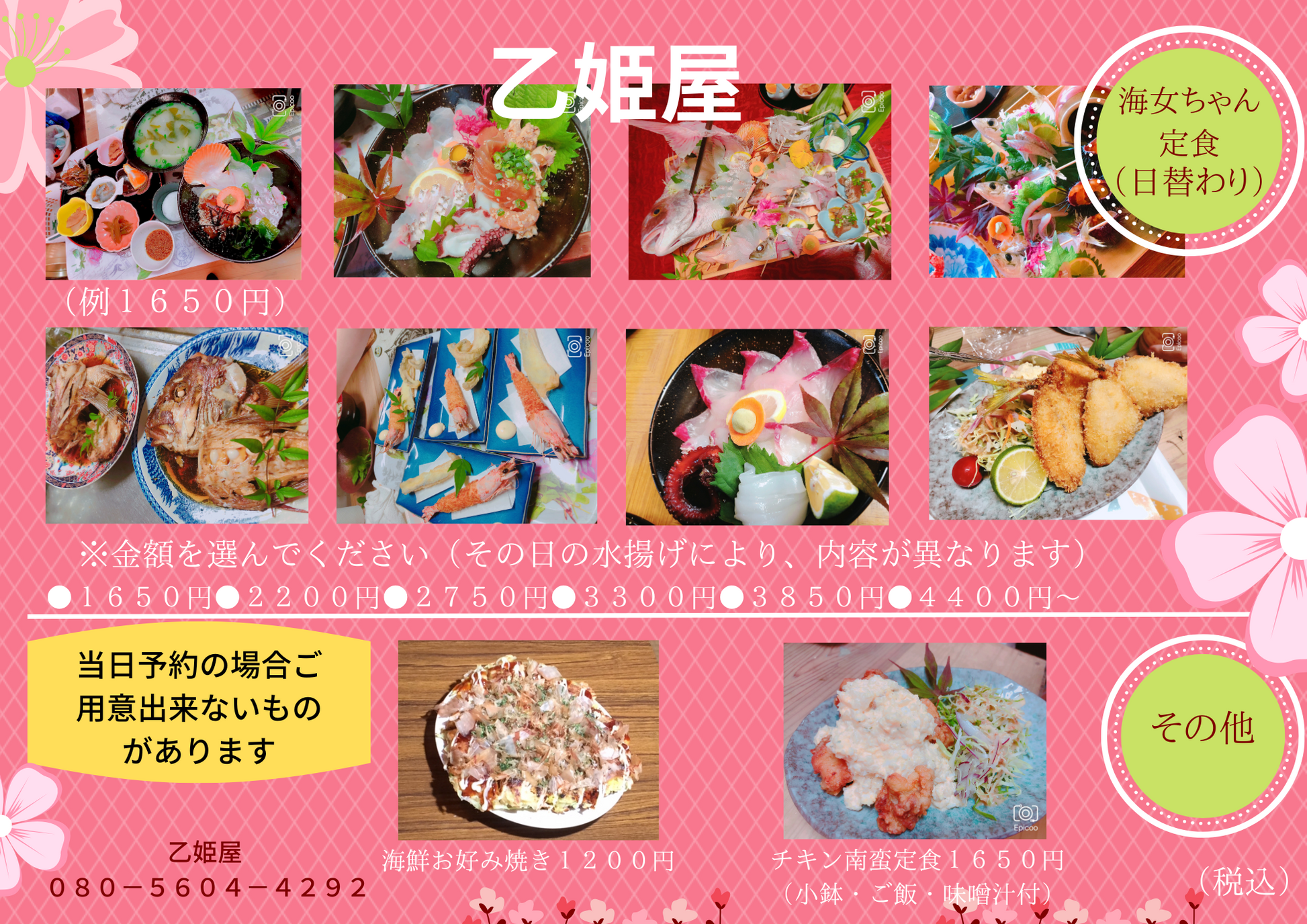予約は「定食・・・海鮮中心のメニューで、中身はお任せとなり品数が増えていきます」または「にゃんピザメニュー」のいずれかのメイン料理をお選びいただく必要がございます。そのほかのお料理は当日店舗にてご注文可能です。