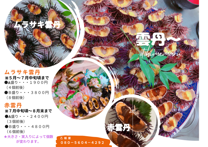 海女である女将と漁師である「乙姫丸」の船長が丹精込めて調達しました、新鮮な魚介類をぜひご堪能ください。